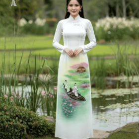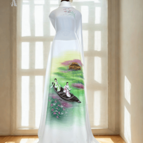 Vải áo dài vẽ tay phong cảnh sông quê cao cấp thiết kế sáng tạo độc đáo