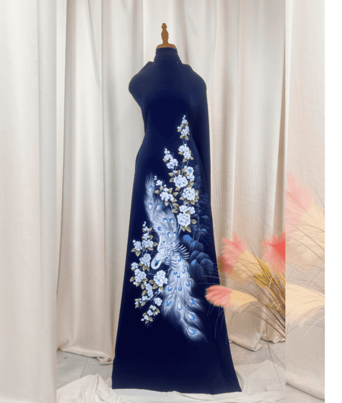 Vải Áo Dài BRAHMA – Chim Công Vẽ Tay, Nền Xanh Than Sang Trọng Cho Bà Sui