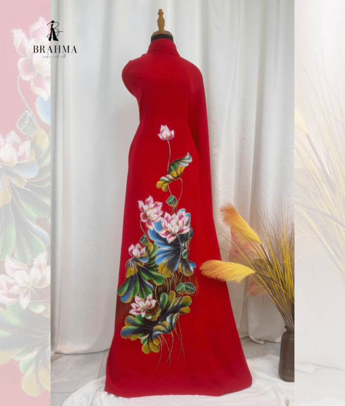 Vải Áo Dài Đỏ Vẽ Tay Hoa Sen Ép Đá – Thuần Khiết & Sang Trọng