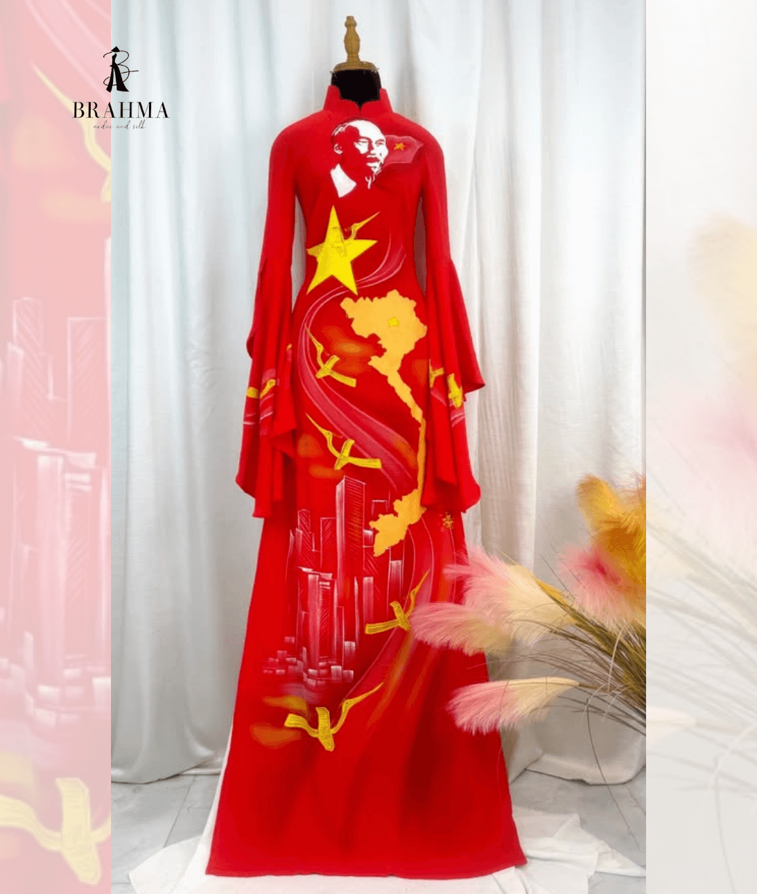 áo dài vẽ tay kỷ niệm 80 năm quốc khánh 2/9 với chân dung bác hồ, bản đồ việt nam, ngôi sao vàng và hình ảnh chim lạc tung bay. thiết kế thủ công tinh tế trên nền đỏ rực rỡ, tái hiện chặng đường lịch sử và khát vọng hiện đại của dân tộc việt nam….