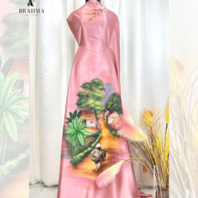 áo dài vẽ tay khung cảnh làng quê việt với mái nhà ngói đỏ, con trâu, hàng cây xanh… được thể hiện thủ công trên nền vải valentino cao cấp mềm mại. thiết kế mang đậm chất nghệ thuật, mộc mạc mà sâu lắng, gợi nhớ ký ức quê hương và niềm tự hào dân tộc….