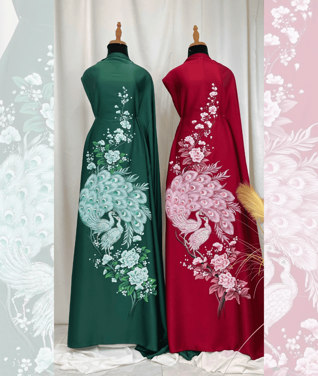 Bộ đôi vải áo dài vẽ tay họa tiết chim công này chính là lời giải cho bài toán ấy.