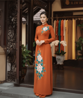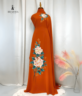“Vải áo dài hoa mẫu đơn BRAHMA – vẽ tay thủ công tinh xảo bởi nghệ nhân giàu kinh nghiệm. Họa tiết sang trọng, sống động, nền vải đa sắc (đỏ, tím, xanh, cam, navy) giúp tôn dáng và mang đến nét đẹp độc bản.”