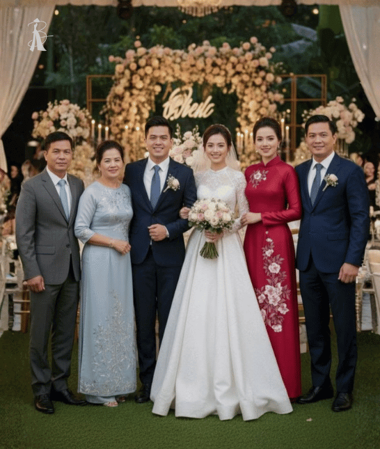 Sở hữu vải áo dài vẽ tay cho bà sui trên chất liệu Valentino cao cấp. Họa tiết vẽ tay hoa hồng trắng tinh tế, bố cục tôn dáng giúp chị sui sang trọng và nổi bật.