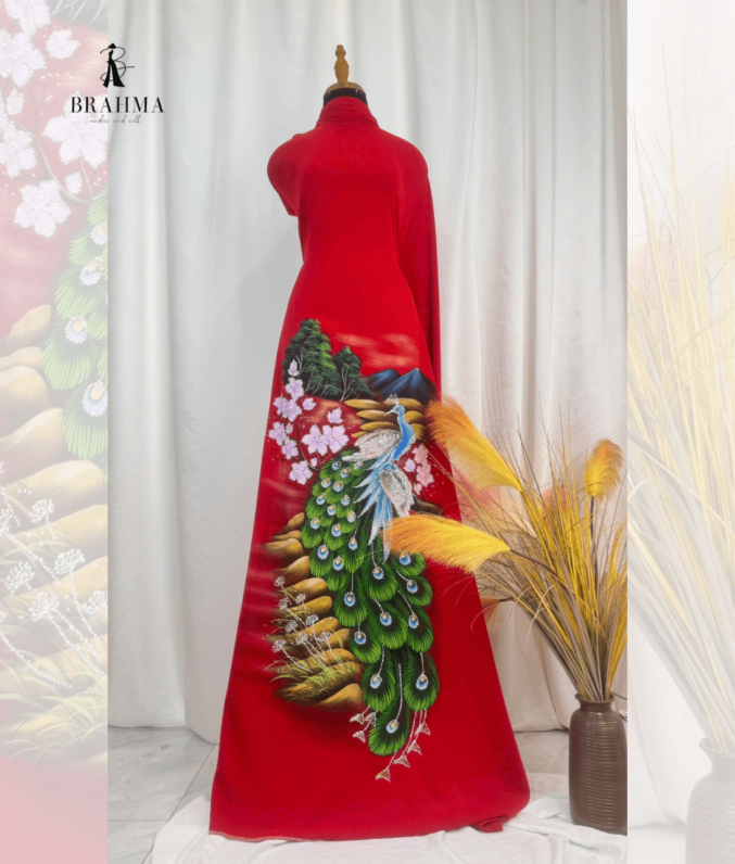 vải áo dài vẽ tay chim công kết hợp ép đá thủ công, màu sắc sang trọng, tôn da, tôn dáng. thiết kế độc bản, phù hợp cho bà sui, đi tiệc, lên sân khấu hoặc sự kiện đặc biệt. không sản xuất đại trà, mỗi mẫu giới hạn số lượng.,….