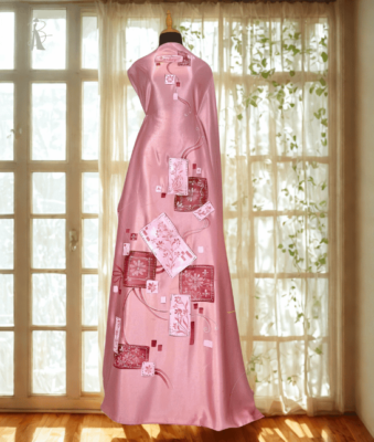 Vải áo dài vẽ tay đi tiệc sang trọng từ BRAHMA. Thiết kế hiện đại phối sắc hồng đỏ đô nổi bật, họa tiết vẽ tay thủ công độc quyền giúp tôn dáng và khẳng định gu thẩm mỹ đẳng cấp.