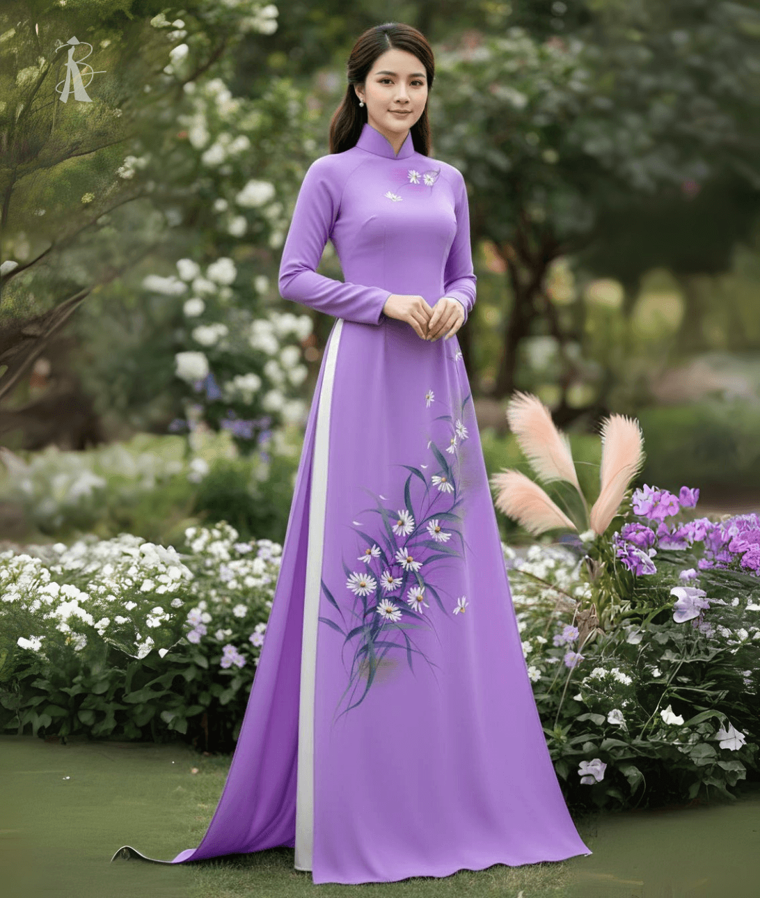 Vải áo dài vẽ tay hoa thủ công tinh xảo, chất liệu lụa cao cấp mềm mại, giúp tôn dáng và mang vẻ đẹp độc bản.