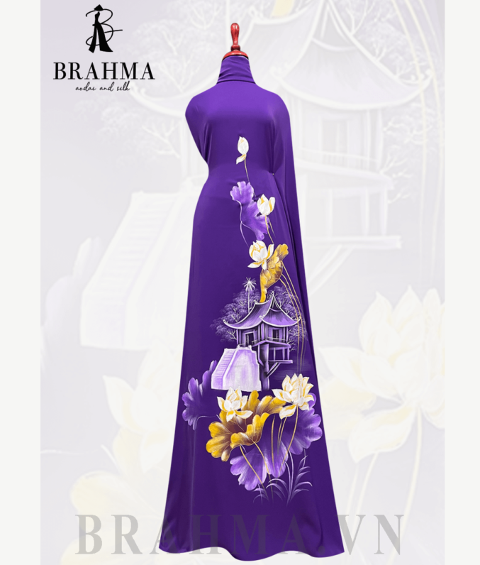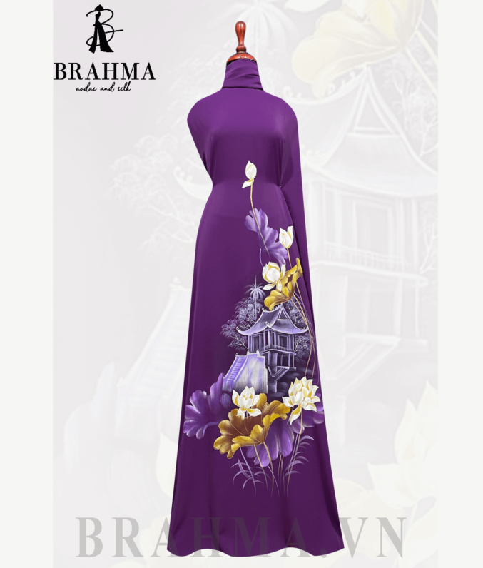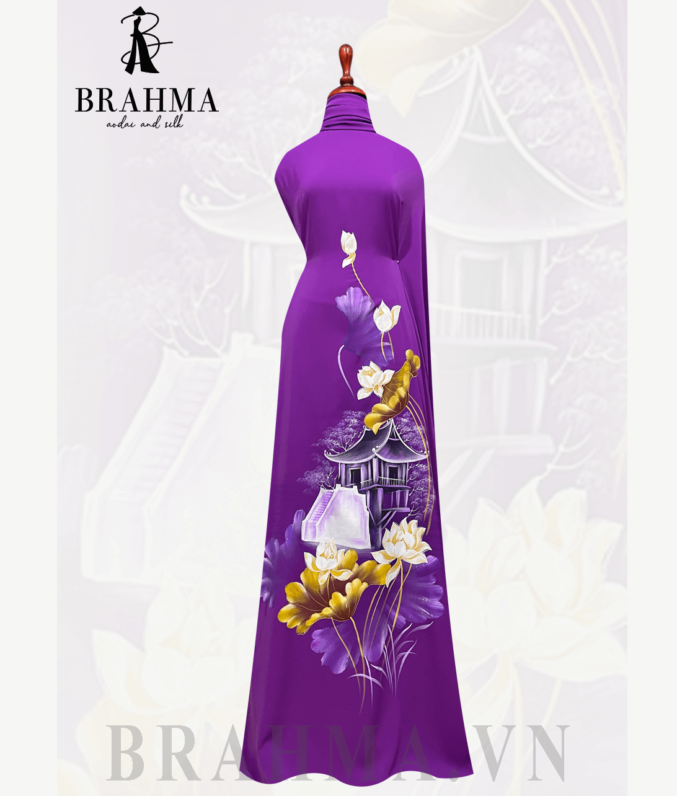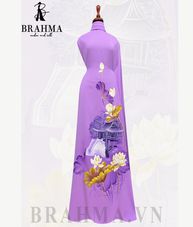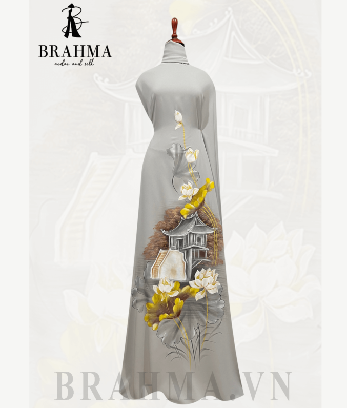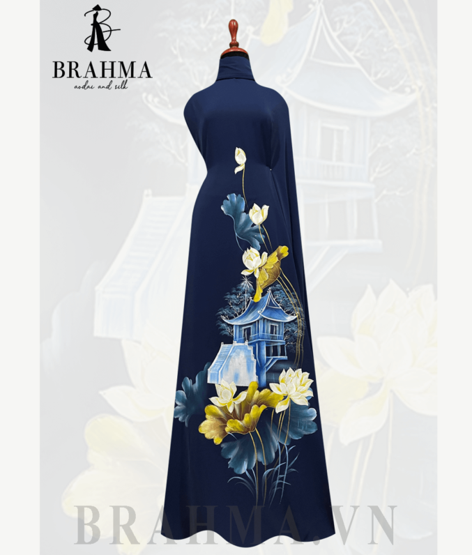 Trên nền vải áo dài BRAHMA tinh tế, họa tiết chùa Một Cột và hoa sen được tái hiện một cách tinh xảo và độc đáo bởi bàn tay tài năng của các họa sĩ. Hình ảnh của chùa Một Cột, một biểu tượng văn hóa lịch sử của Việt Nam, được kết hợp cùng với vẻ đẹp thanh nhã và tinh tế của hoa sen, tạo nên một bức tranh đầy ý nghĩa và sâu sắc.