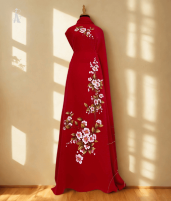 Vải áo dài vẽ tay sắc đỏ quyến rũ trên nền lụa cao cấp. Họa tiết hoa nhỏ vẽ tay thủ công tinh tế giúp tôn dáng, mang lại vẻ đẹp thanh lịch, sang trọng và đậm chất nghệ thuật độc bản.