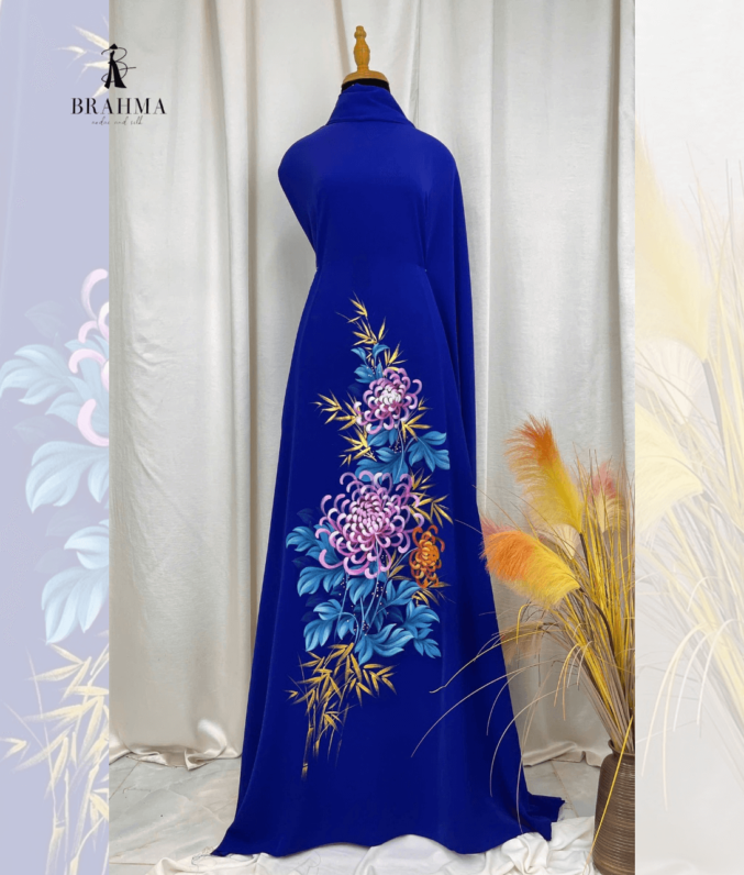 Vải Áo Dài Vẽ Tay Hoa Cúc Nền Xanh Hoàng Gia – Nghệ Thuật & Tôn Dáng